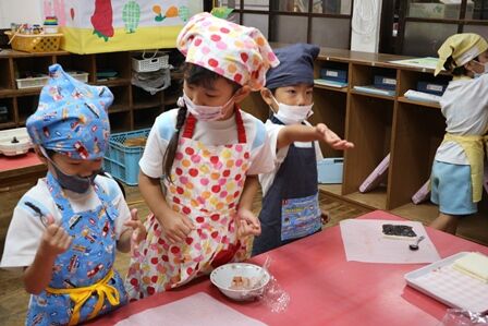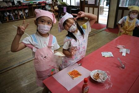 2人で1組になり、ソースを塗る・具材を乗せる、仲良く役割分担をして作業してもらいました!とっても簡単なので、あっという間にサンドが完成!「どんな姿になって、出てくるかなぁ」と楽しみにしながら、焼き上がるのを待ちます⏰!チーンとなったら、とってもいいきつね色に!チーズはとろーり🧀はみ出ていたり、とっても美味しそうに焼けました!