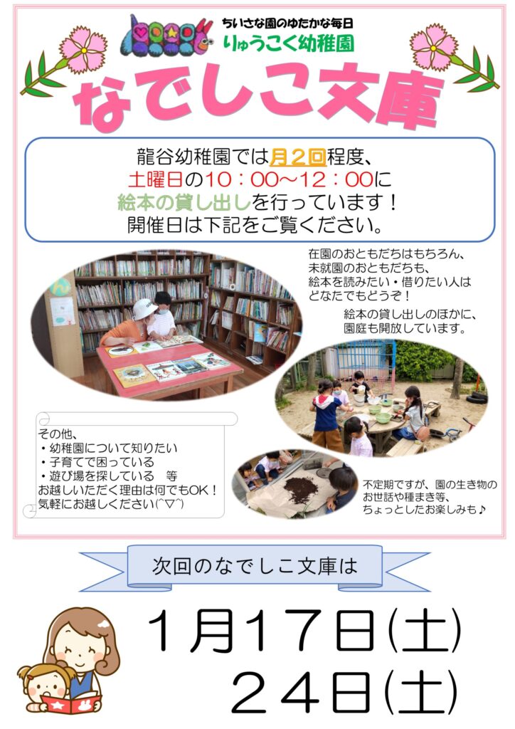2026/01/17,24 なでしこ文庫 2025-12-13 最終更新日時 : 2025-12-13 nakanohitoなでしこ文庫は予約不要の園庭・図書室解放です。 🌱 入園説明会は1人からでも開催しています 🌱 ご予約フォームを開く お気軽にご参加ください😊 この投稿をInstagramで見る龍谷幼稚園(@ryukokukindergarten)がシェアした投稿 \ 最新情報をチェック /