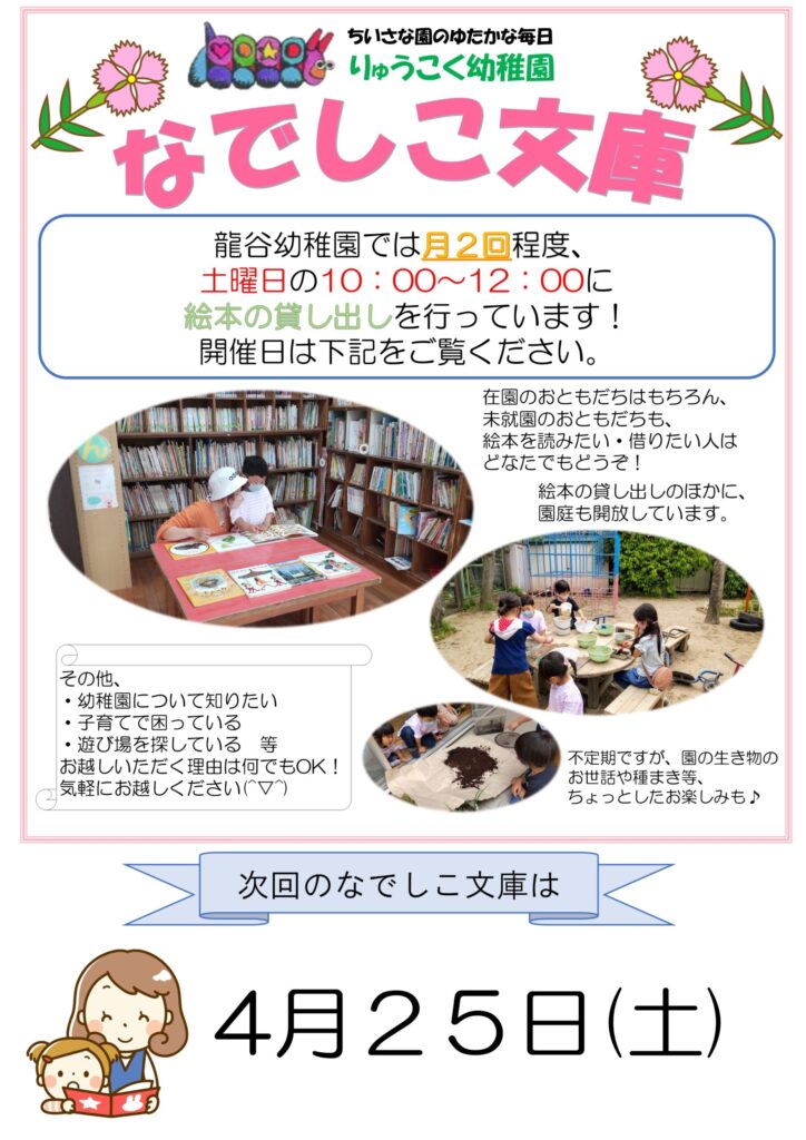 2026/04/25 なでしこ文庫 2026-04-03 最終更新日時 : 2026-04-03 nakanohitoなでしこ文庫は予約不要の園庭・図書室解放です。 🌱 入園説明会は1人からでも開催しています 🌱 ご予約フォームを開く お気軽にご参加ください😊 この投稿をInstagramで見る龍谷幼稚園(@ryukokukindergarten)がシェアした投稿 \ 最新情報をチェック /